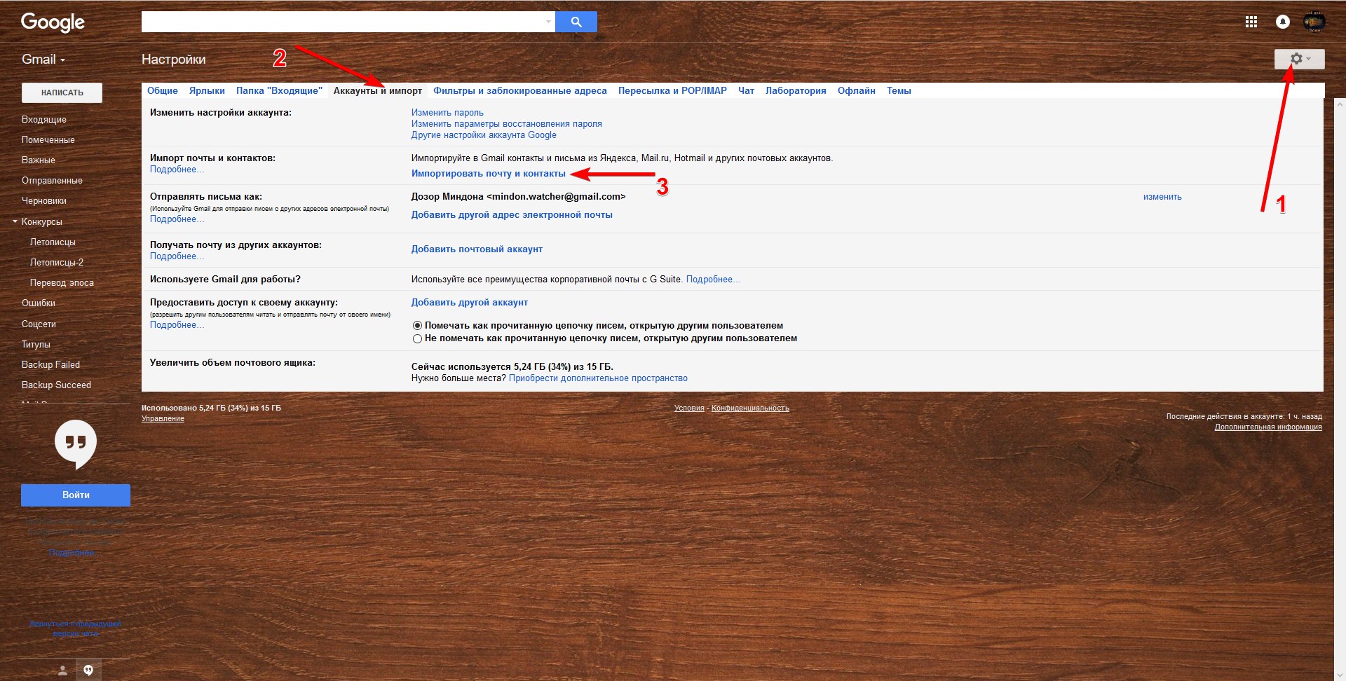 Далее вам предложит ввести адрес почты, из которой будет осуществляться импорт (например, mindon.watcher@mail.ru) и пароль от этой почты (той, из которой вы собираетесь импортировать почту и контакты). Если всё введено верно, вам предложат выбрать параметры импорта (что импортировать). Обратите внимание, что эта система работает 30 дней, затем нужно будет повторить процесс.